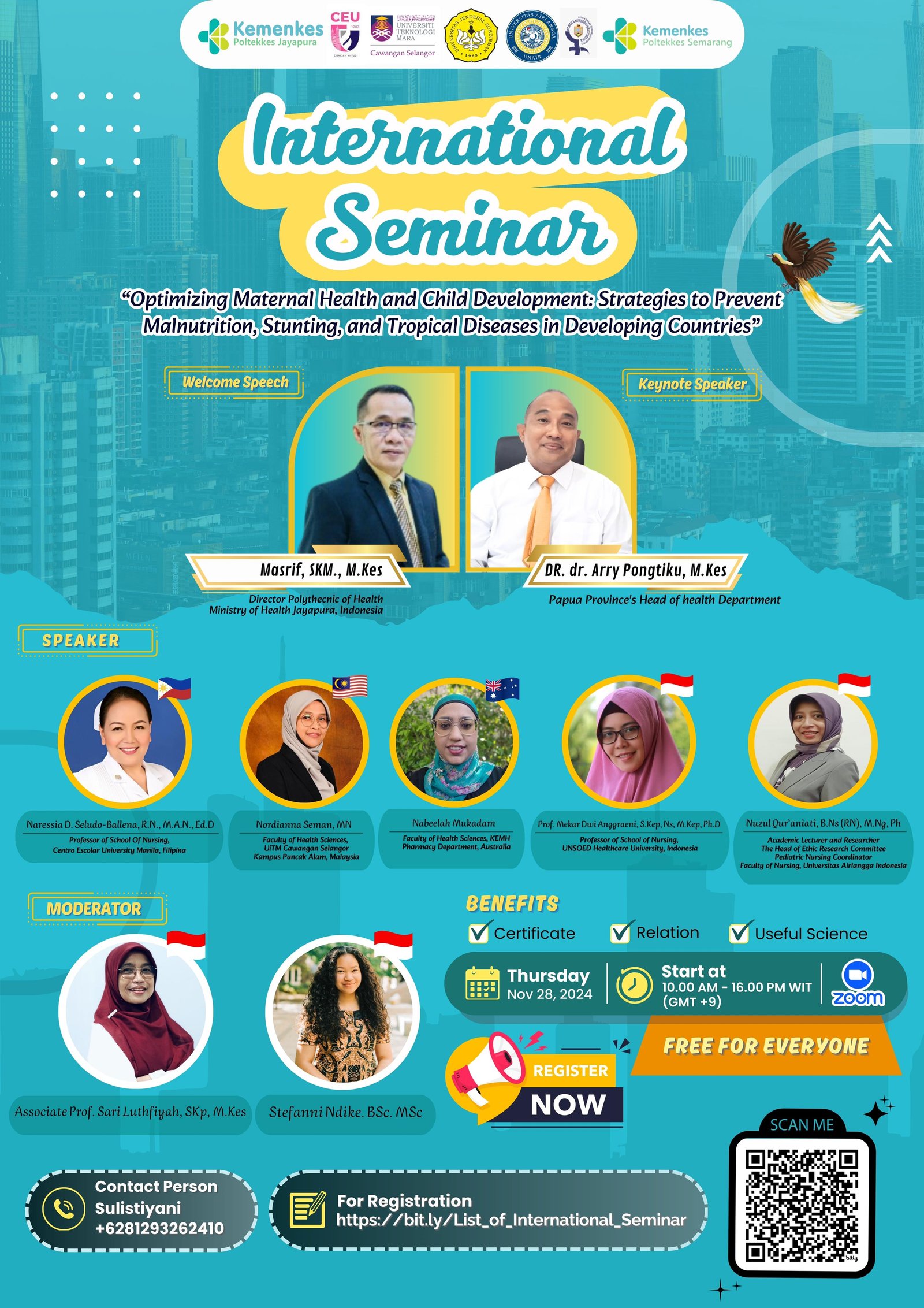 By organizing a seminar, Poltekkes Kemenkes Jayapura hopes to play a more active role in sharing effective strategies for optimizing maternal health and child development. By focusing on prevention and intervention, we can address malnutrition, stunting, and tropical diseases more effectively and promote sustainable development in developing countries. The theme of this international seminar is "Optimizing Maternal Health and Child Development: Strategies to Prevent Malnutrition,Stunting, And Tropical Diseases In Developing Countries".
